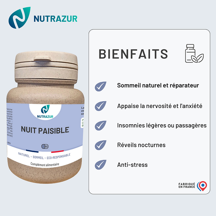 Contrairement à d'autres somnifères qui peuvent entraîner une accoutumance et une somnolence, Nuit Paisible est 100% naturelle et ne provoque aucun effet secondaire.