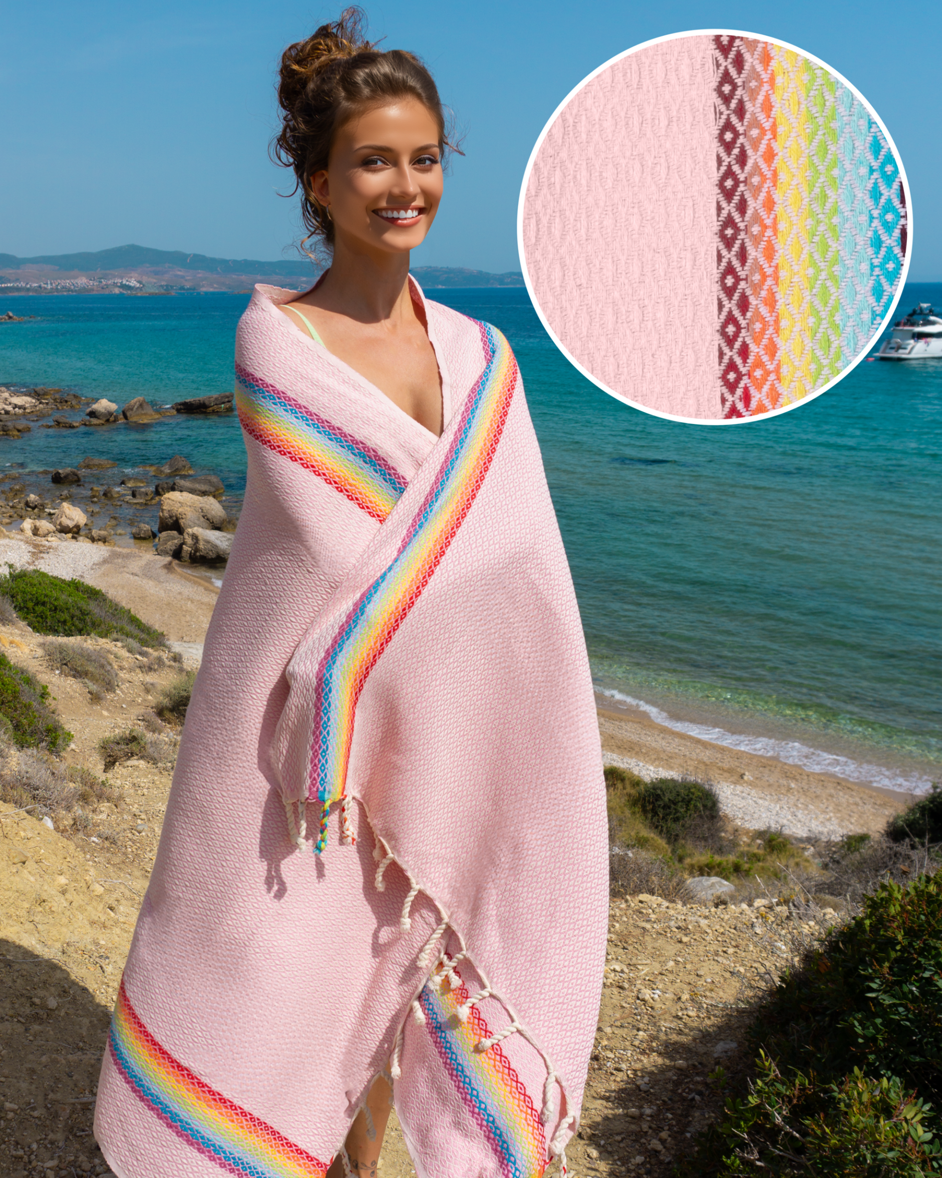 RAINBOW Beach Towel, Turkish Hammam Towel, Spa & Sauna Towel - Pink